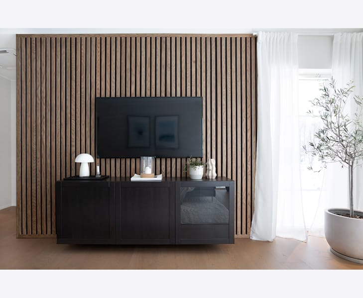 Et veggpanel av treribber montert på en lydabsorberende nålefilt egnet for innendørs vegger. Valgene er mange når det kommer til ribbepaneler og resultatet blir umiddelbart tilfredsstillende! Lag en stilig fondvegg, gang eller sengegavl med Ribwall. Tilgjengelig i farger - Ek Natur, Ek Raw och Ek Macchiatomed med to forskjellige baksider, svart og blondt.