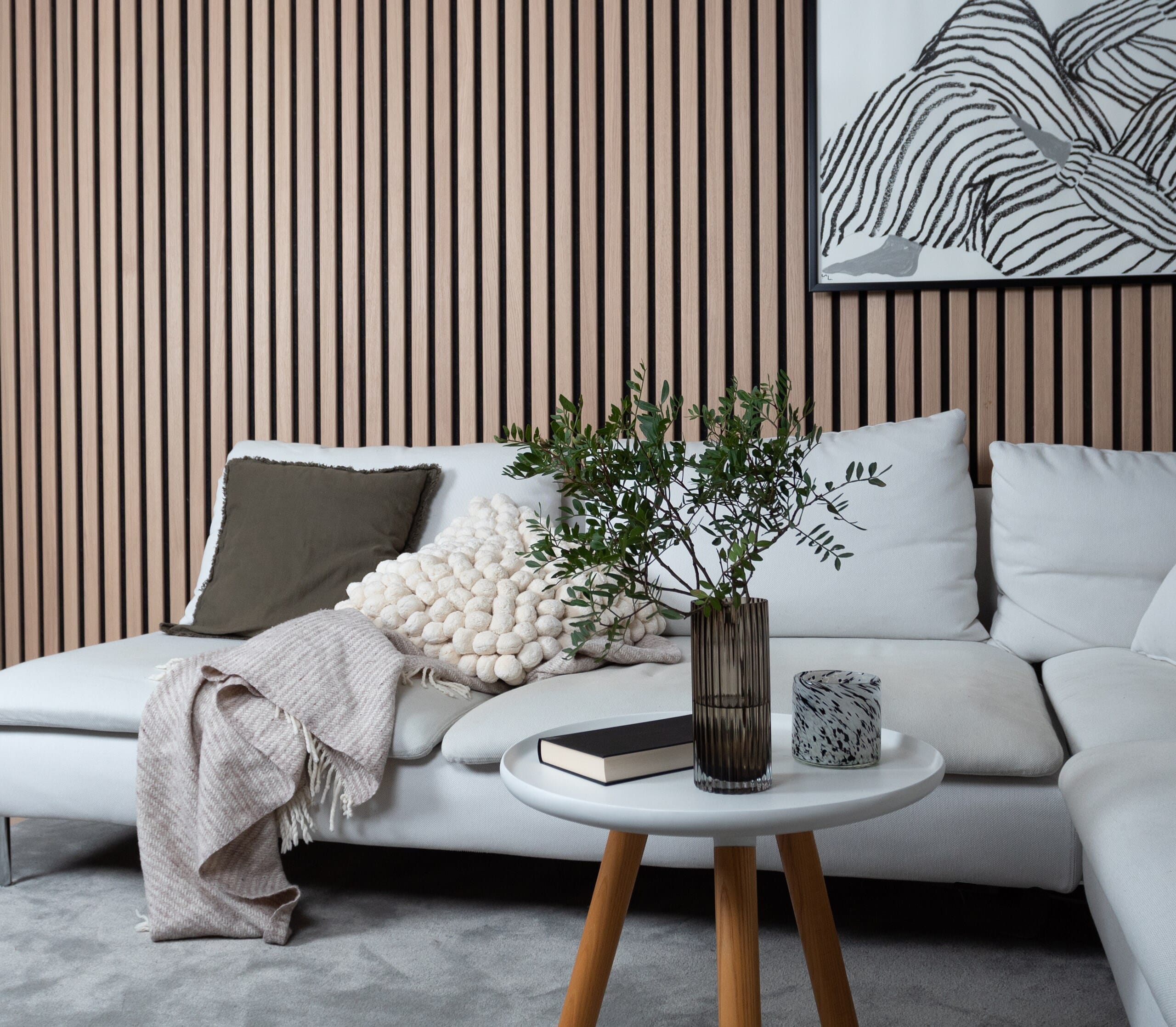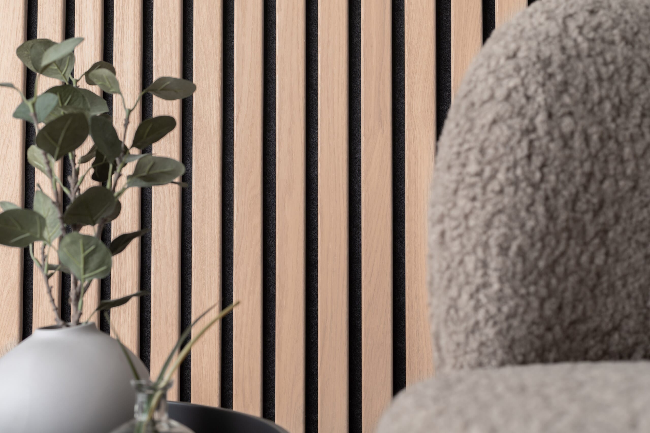 Et veggpanel av treribber montert på en lydabsorberende nålefilt egnet for innendørs vegger. Valgene er mange når det kommer til ribbepaneler og resultatet blir umiddelbart tilfredsstillende! Lag en stilig fondvegg, gang eller sengegavl med Ribwall.