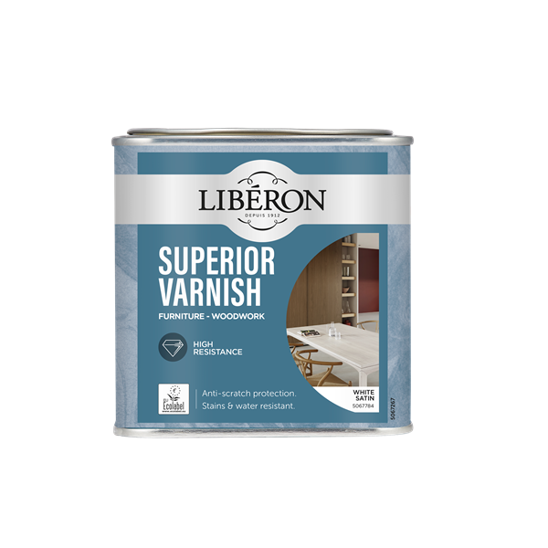 Liberon Superior Varnish er en vannbasert lakk spesielt utviklet for møbler, gulv, trapper, vegger, kjøkken og bad. Superior Varnish innholder keramiske partikler som gir god beskyttelse mot riper, hakk, flekker og vann. Denne lakken bevarer treverkets naturlige struktur og gir en vakker, slitesterk overflate. Superior Varnish har lavt VOC-innhold, er luktsvak og er merket med EU-blomsten. Noe som gjør den til et trygt og miljøvennlig valg for ditt hjem. Den er ideell for både nytt, ubehandlet og tidligere lakkert treverk. Superior Varnish kan brekkes til ønskes farge for å passe ditt interiør.