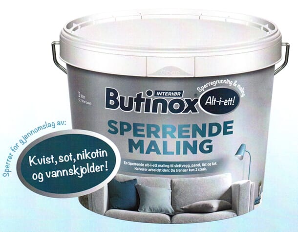 Butinox Interiør Sperrende maling utnytter en kombinasjon av høykvalitets akryl og et spesielt reaktivt råstoff som ti sammen gir svært gode sperrende egenskaper mot misfarging fra underlaget. Komponenter fra kvist, sot, vannskader og nikotin som trenger gjennom vanlige malinger og gir misfarging vil med denne teknologien bli bundet opp i malingsfilmen.