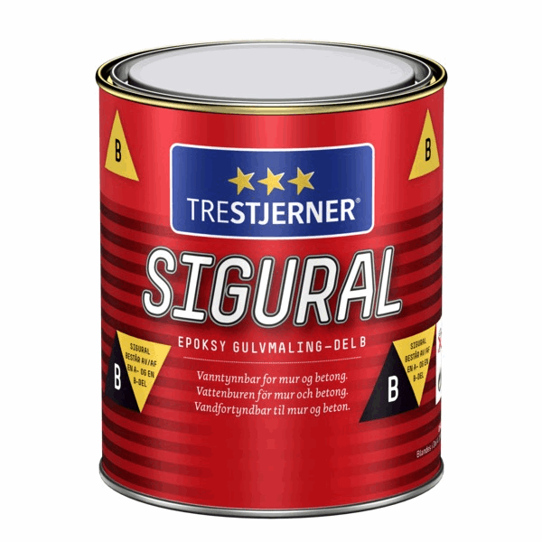 TreStjerner Sigural B komponent 0,84L må blandes med A komponent 1,86L før bruk. 2 komponent epoksymaling til betonggulv. Meget slitesterk.