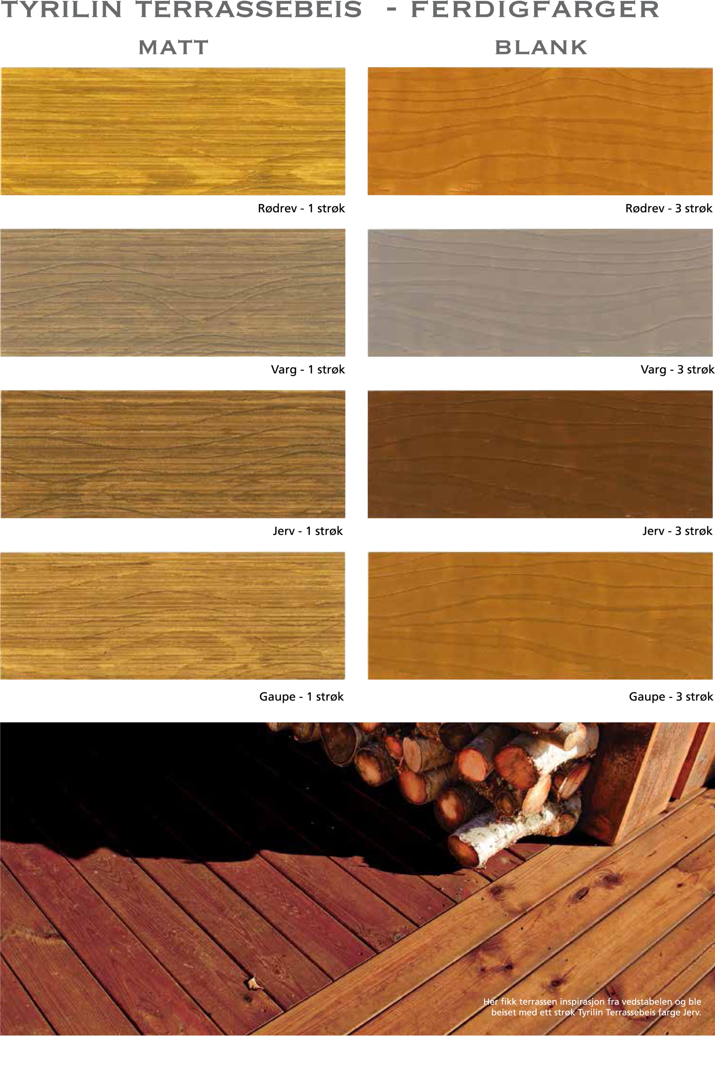 Tyrilin Terrassebeis henter frem den samme løden som våre øvrige beiser gjør. Det skaper en vakker overflate hvor trestrukturen løftes frem via et utvalg på fire nydelige naturfarger som harmonerer godt med veggfargene. Beisen trenger meget godt inn i treverket og gir en utsøkt, dyp lød med mye preg.