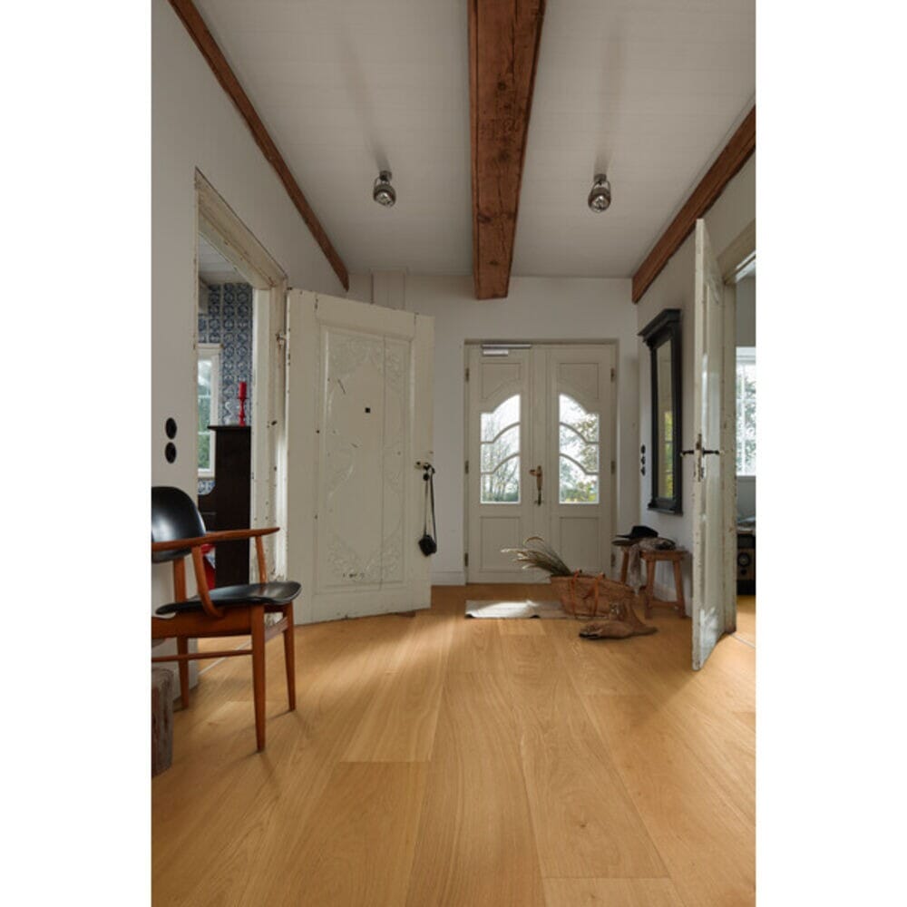 Klassisk tre møter høyteknologiske innovasjoner. Toppsjikt i edelt tre sammensmeltes og forsterkes med mineraler, fibre og naturlige substanser. Mellomsjikt i stabil HDF og bunnsjikt av tre. Lindura Surface Technology gir høy styrke mot trykkbelastning, komfortabel overflate og et holdbart vedlikeholdsvennlig gulv. Høye heler, fotballsko og fallende gjenstander gjør vesentlig mindre inntrykk sammenlignet med ordinær parkett. Ultra matt lakkfinish og store dimensjoner forsterker et genuint og robust uttrykk. Rask, solid og trygg montering med 5G Dry-click system. Gulv med antibakteriell effekt ved regelmessig rengjøring uten kjemiske tilsetningsstoffer. Aqua-Stop kantbehandling forsterker motstandsdyktigheten mot stående vann i hele 24 timer. Det ekstremt harde toppsjiktet kan ikke slipes.