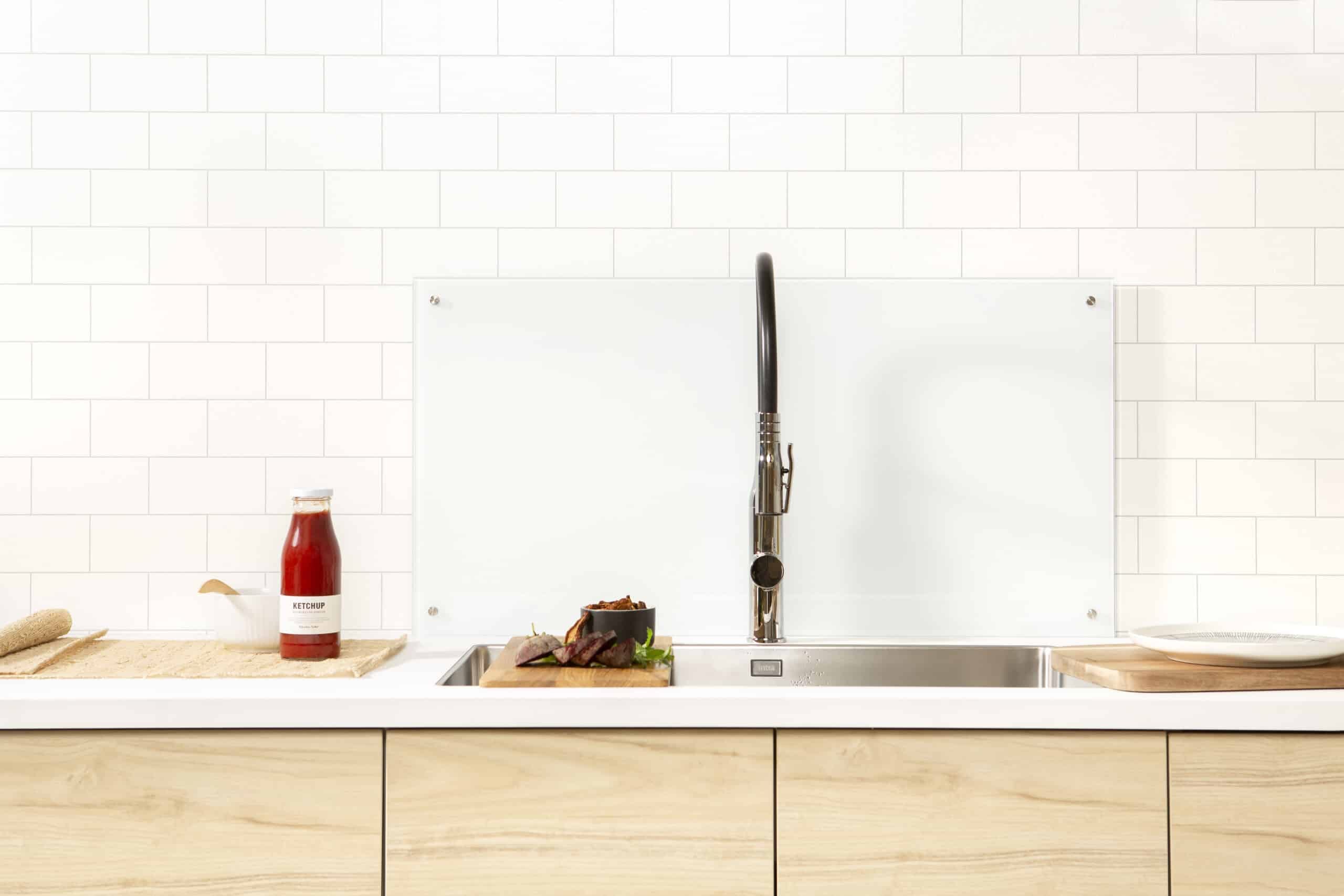 Denne herdede glassplaten er svært stilren og anonym mot bakveggen i ditt kjøkken – og egner seg som beskyttelse bak både vask eller koketopp.