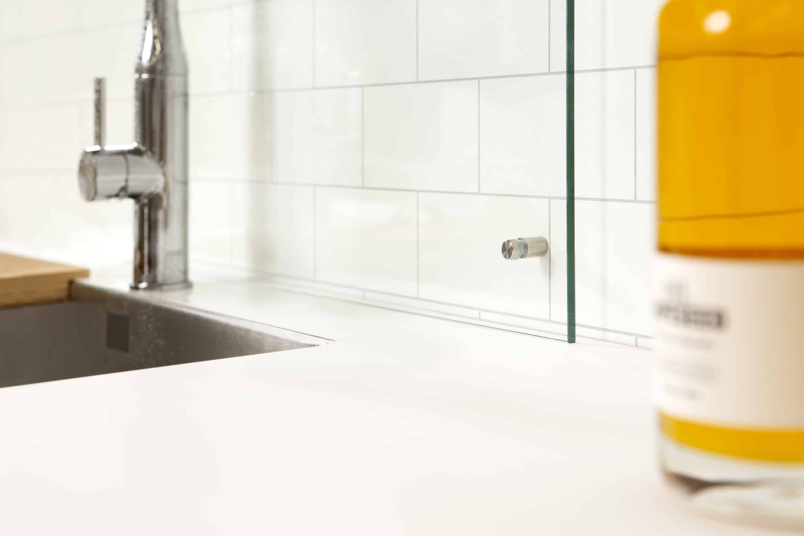 Denne herdede glassplaten er svært stilren og anonym mot bakveggen i ditt kjøkken – og egner seg som beskyttelse bak både vask eller koketopp.