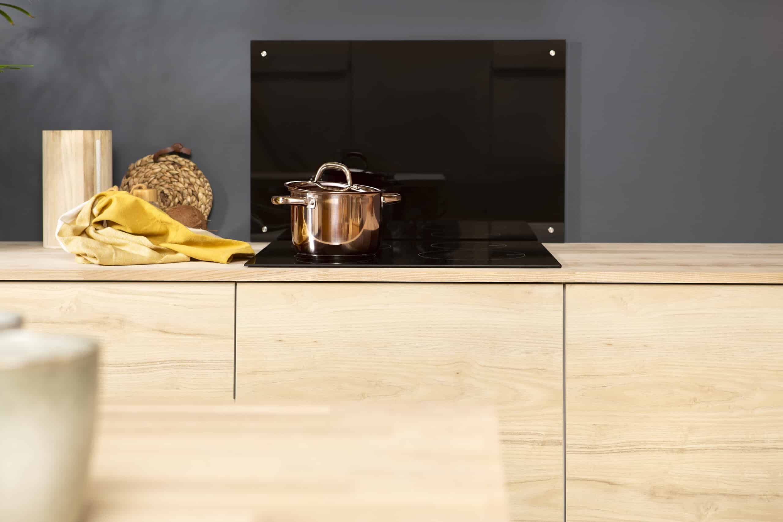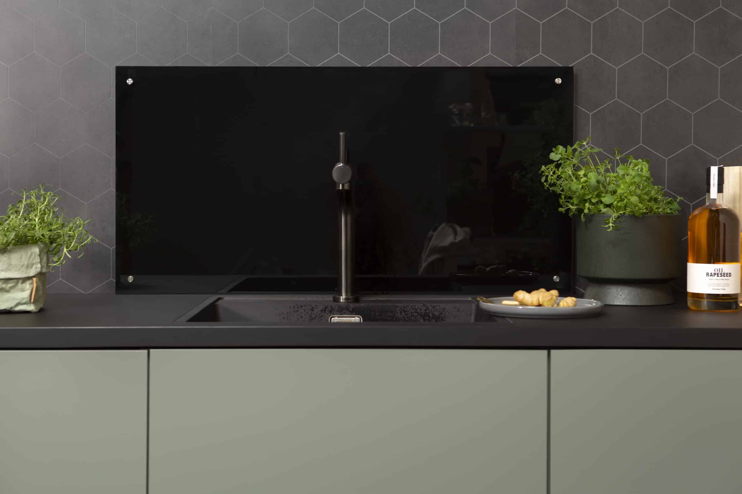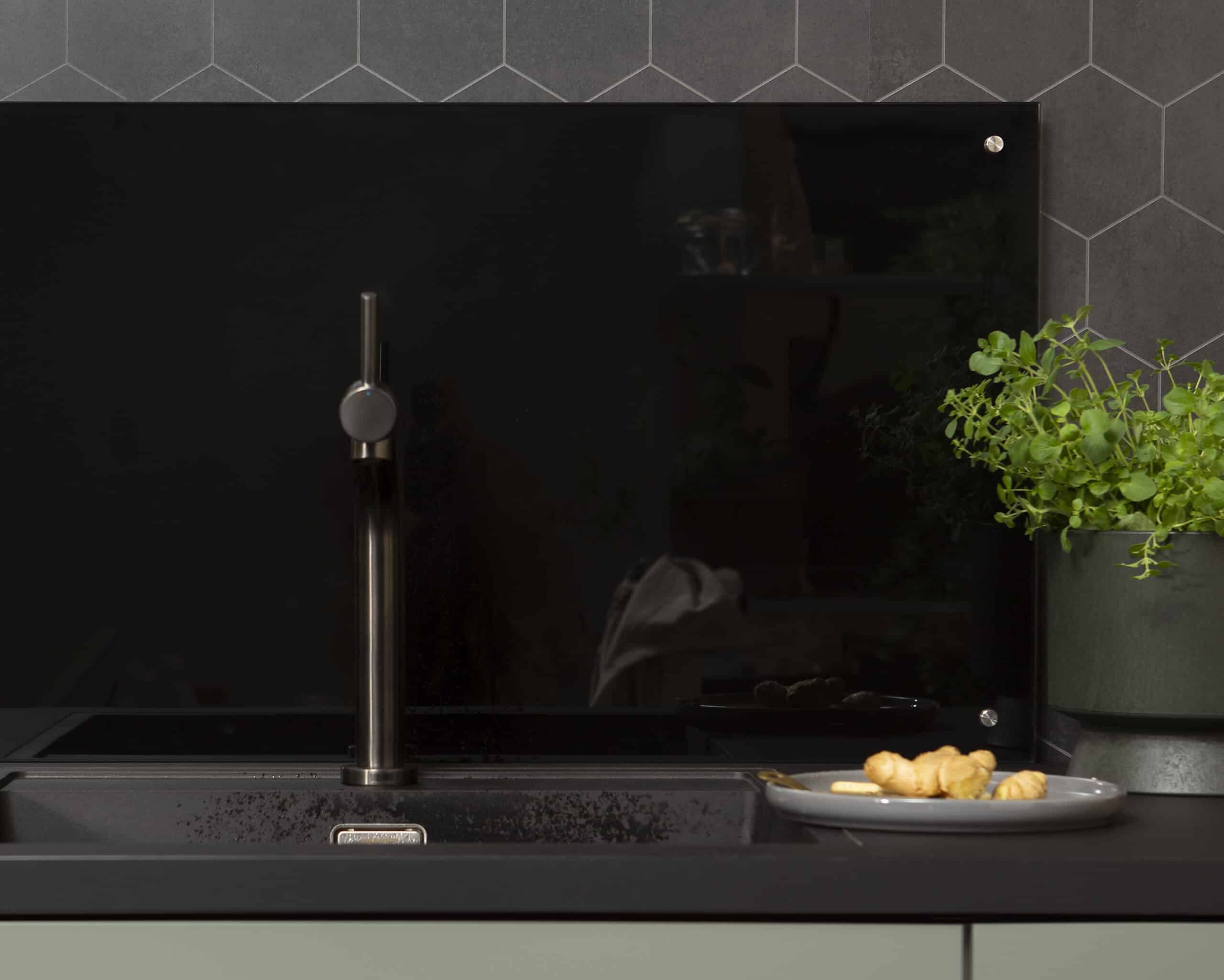 Denne herdede glassplaten er svært stilren og anonym mot bakveggen i ditt kjøkken – og egner seg som beskyttelse bak både vask eller koketopp.