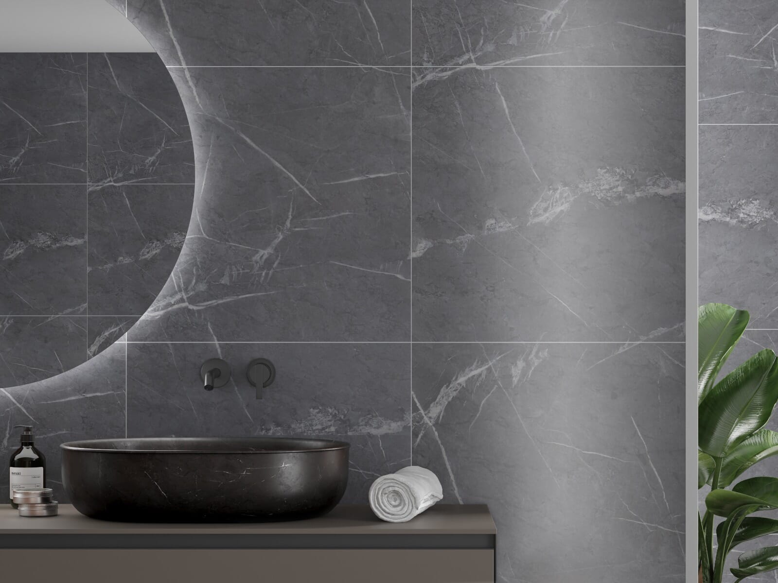 Glans: Silk Flismønster: 60x60cm Fugfarge: Grey