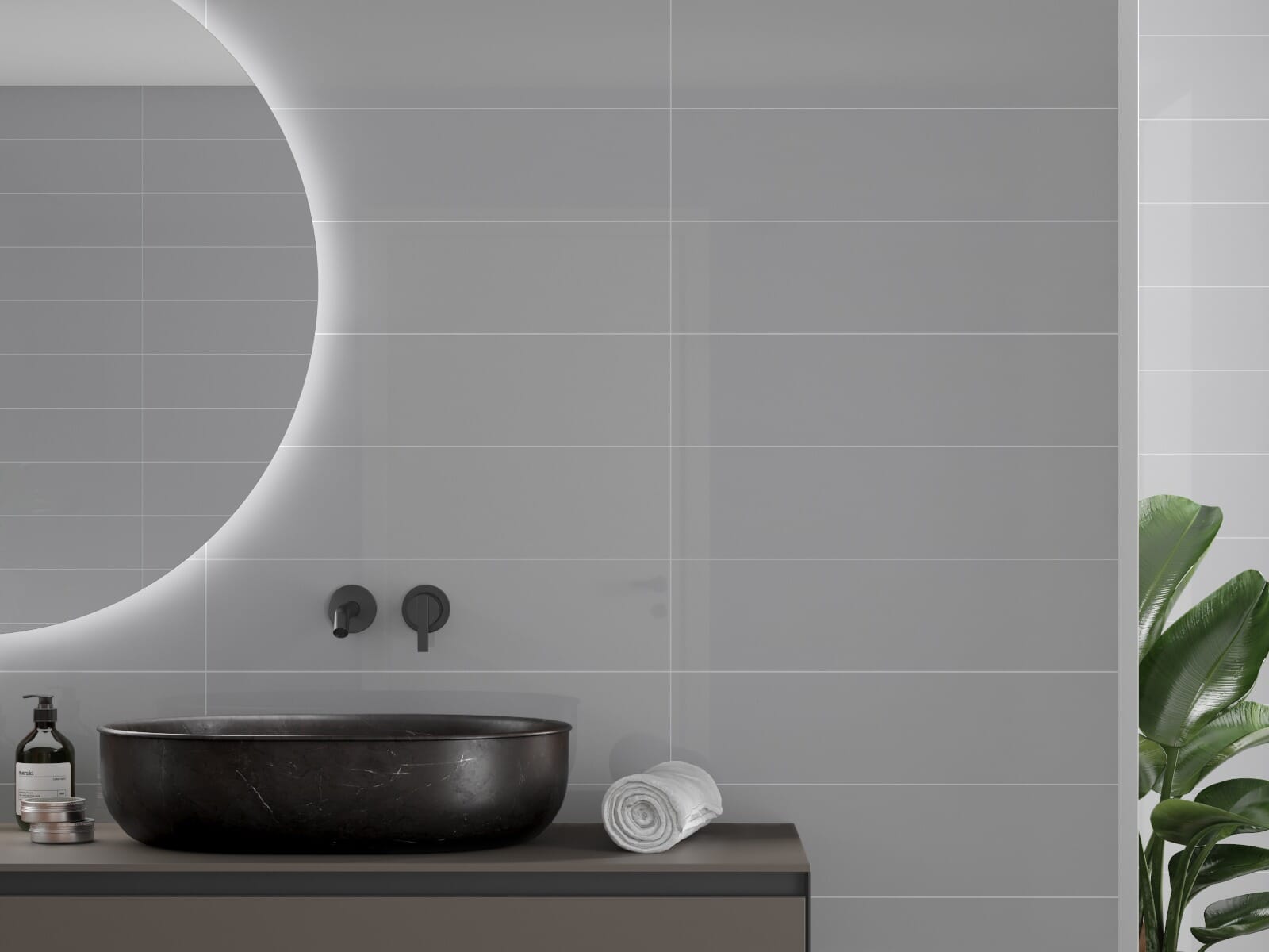 Glans: High Gloss Flismønster: 60x15cm Fugfarge: Grey