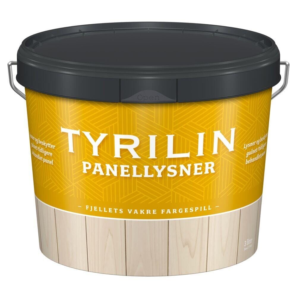 Tyrilin Panellysner Lysner gult panel Ønsker du å lysne panelet slik at det igjen fremstår lyst med godt synlige kvister og årringer, er Tyrilin Panellysner produktet for deg! Produktet er en vanntynnet overfaltebehandling som innholder voks, olje, UV-filter og antioksiderende midler som effektivt beskytter treverk mot videre gulning. Panellysneren er meget luktsvak og brukervennlig, og tørker meget raskt. Med ett strøk lysnes gulnede og tidligere panellakkerte, oljede eller beisede trepanel av furu og gran uten innfarging. Den er velegnet til både vegger og tak og kan påføres i ett eller to strøk, avhengig av ønsket utseende.